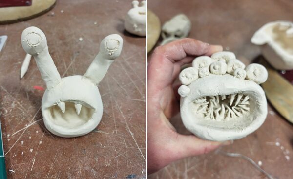 Auteur: Mara Kunstman | Beeld: 1. Alina Hoving Foto Ronald de Haan 2. Willianne Folkers Foto Titus Berens 3-4. Kleimonster met grote bek – Leerlingwerk vmbo 2 (vrije vorm met nadruk op juiste techniek, iets waar Willianne altijd scherp op lette) Foto Alina Hoving