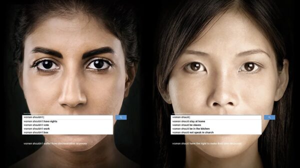 Dezelfde soort bias zien we in de campagne van UN Women en Memac Ogilvy & Mather Dubai uit 2013. Meer dan 10 jaar geleden worden we al geconfronteerd met genderongelijkheid van zoekopdrachten via Google. Op de gezichten van vrouwen staat een Google-zoekbalk met automatische afgemaakte zoekopdrachten zoals “women shouldn’t…” of “women cannot…”. Het algoritme weerspiegelt wat er in onze samenleving leeft, inclusief onze vooroordelen, angsten en machtsstructuren.
